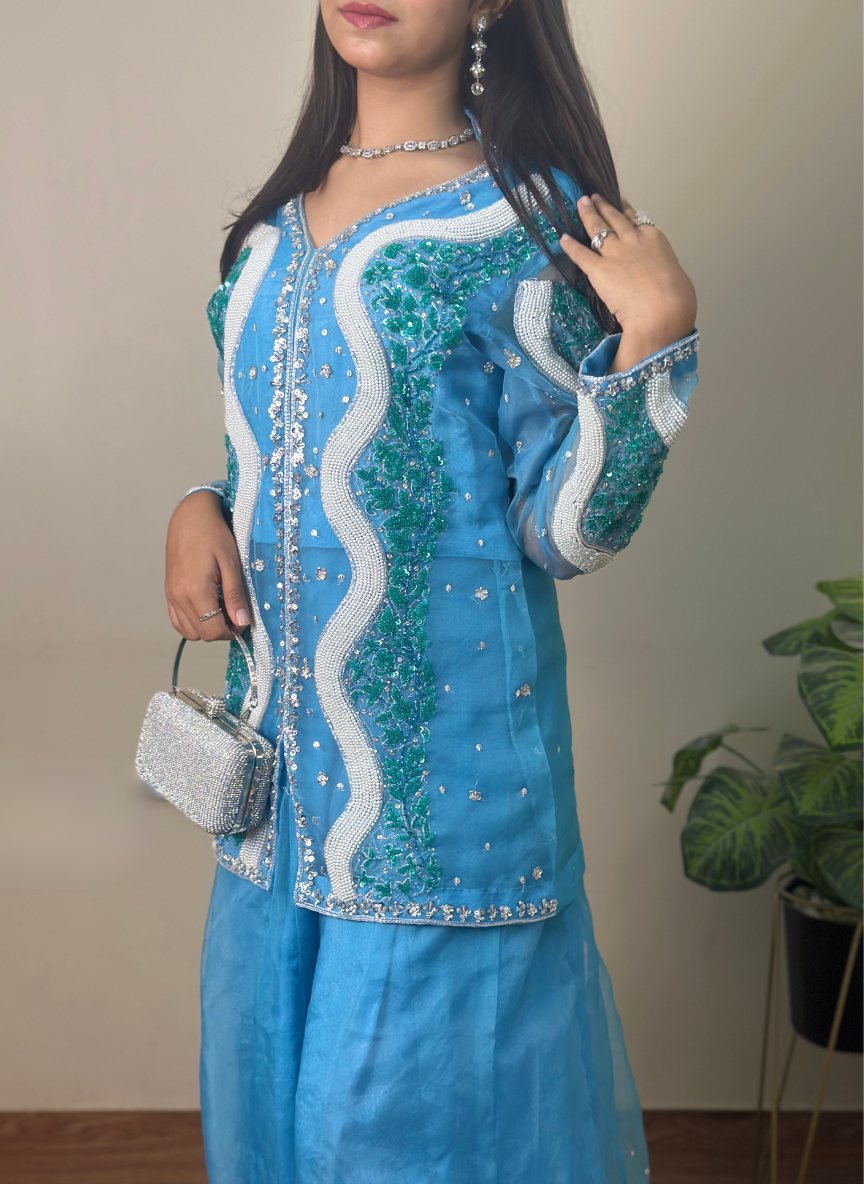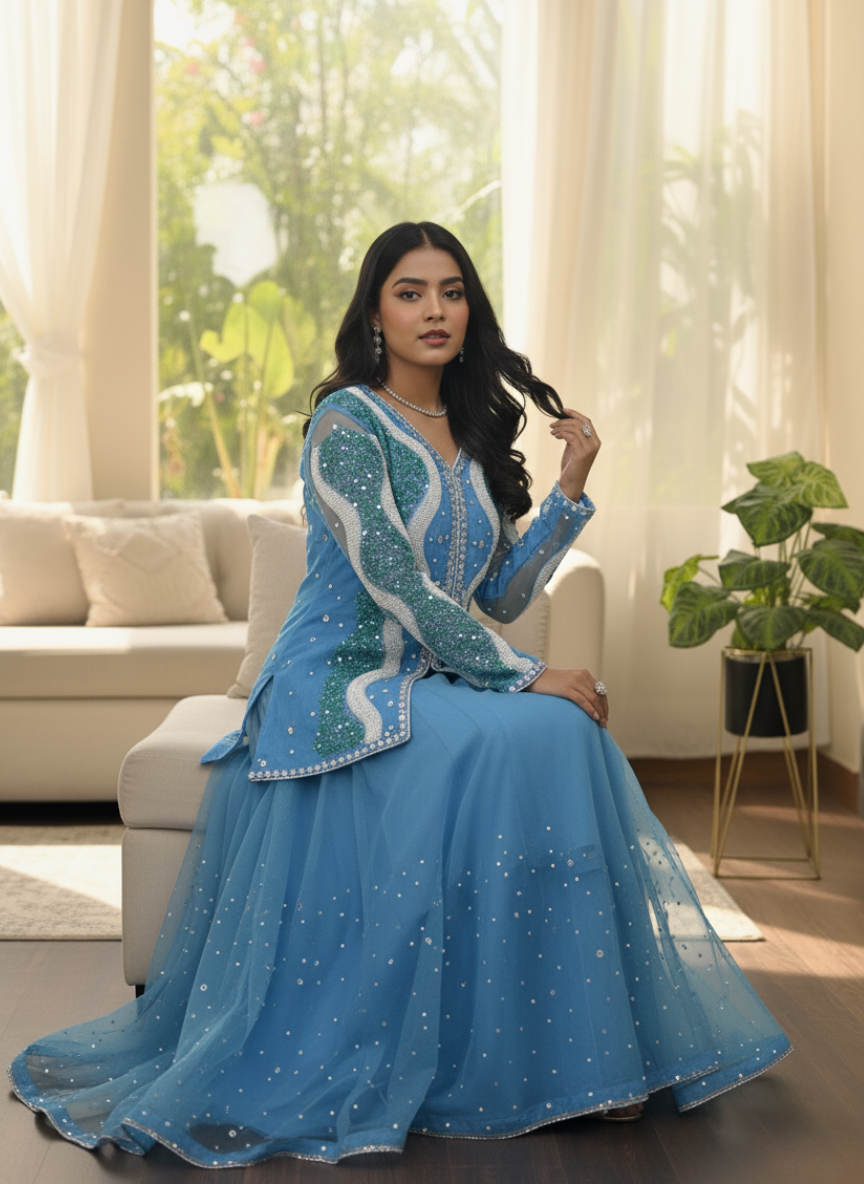 Turn heads this festive season with our short embellished shirt adorned in delicate pearl and stone work, paired with beautifully stone-sprayed lehenga pants. This beautiful festive formal wear blends traditional elegance with a modern silhouette — perfect for weddings, parties, and festive occasions. Fully customizable in any color, this outfit offers timeless style and comfort for your next special event.