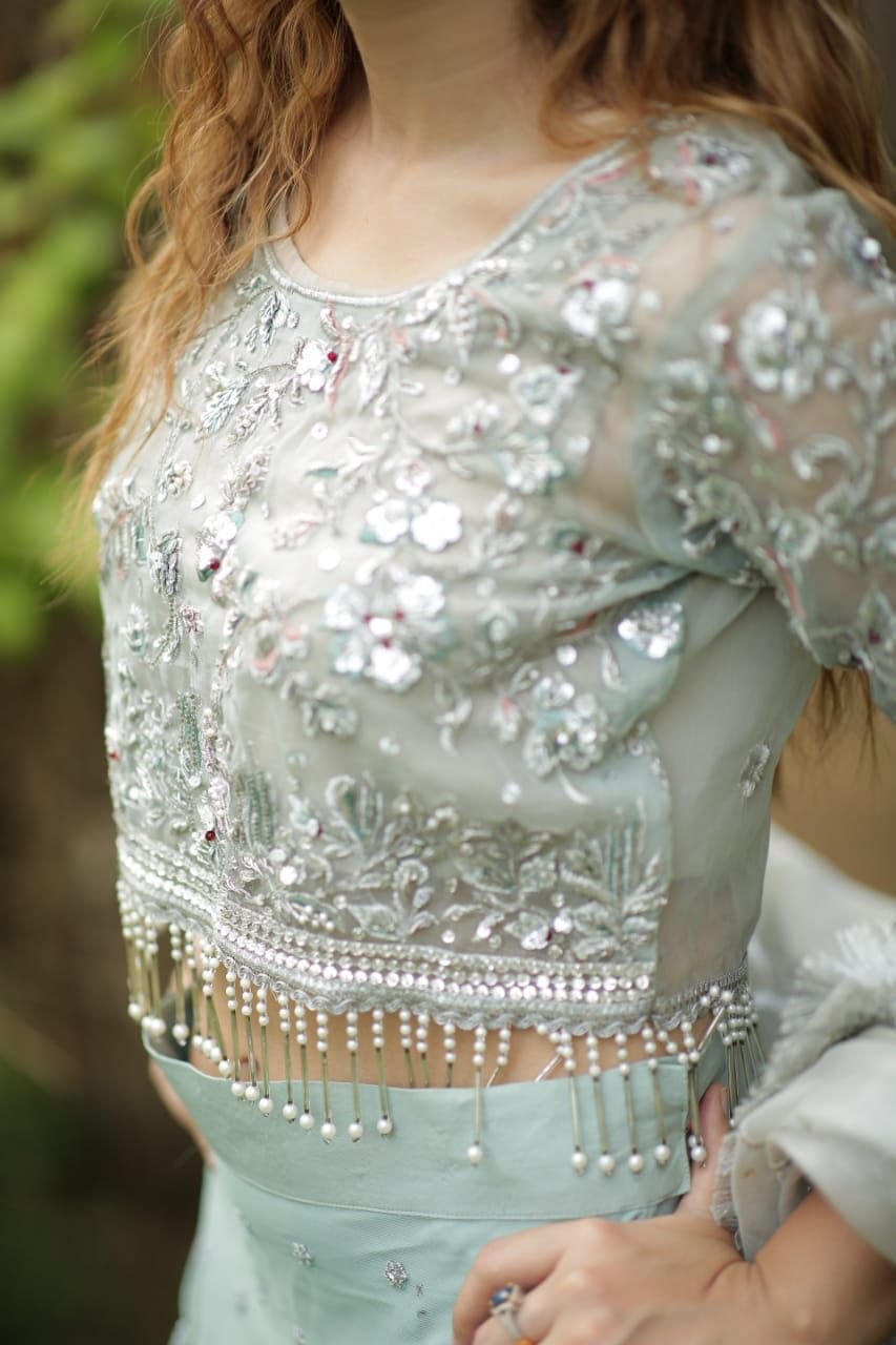 This exquisite lehenga choli features a beautifully embellished blouse adorned with intricate zardozi work, shimmering stones, pearls, and sequins. The straight-cut lehenga flows elegantly, showcasing a delicate spray of stones throughout and finished with a sophisticated silver border that adds a touch of luxury. Paired with a beautifully styled dupatta, this outfit is perfect for any special occasion, from weddings to festive celebrations.