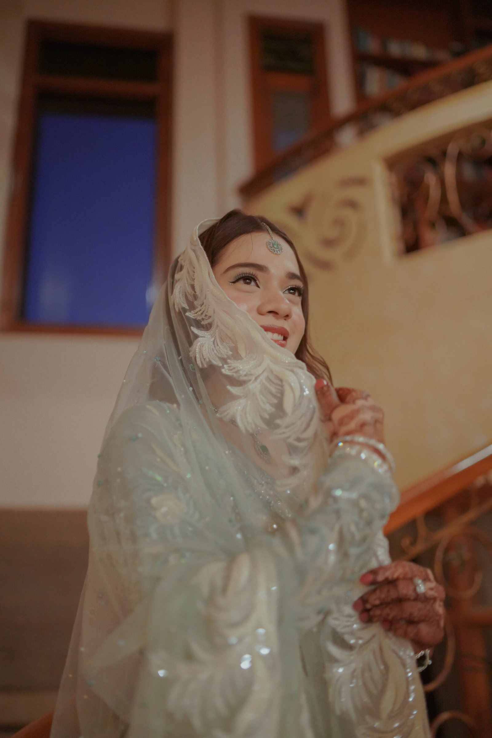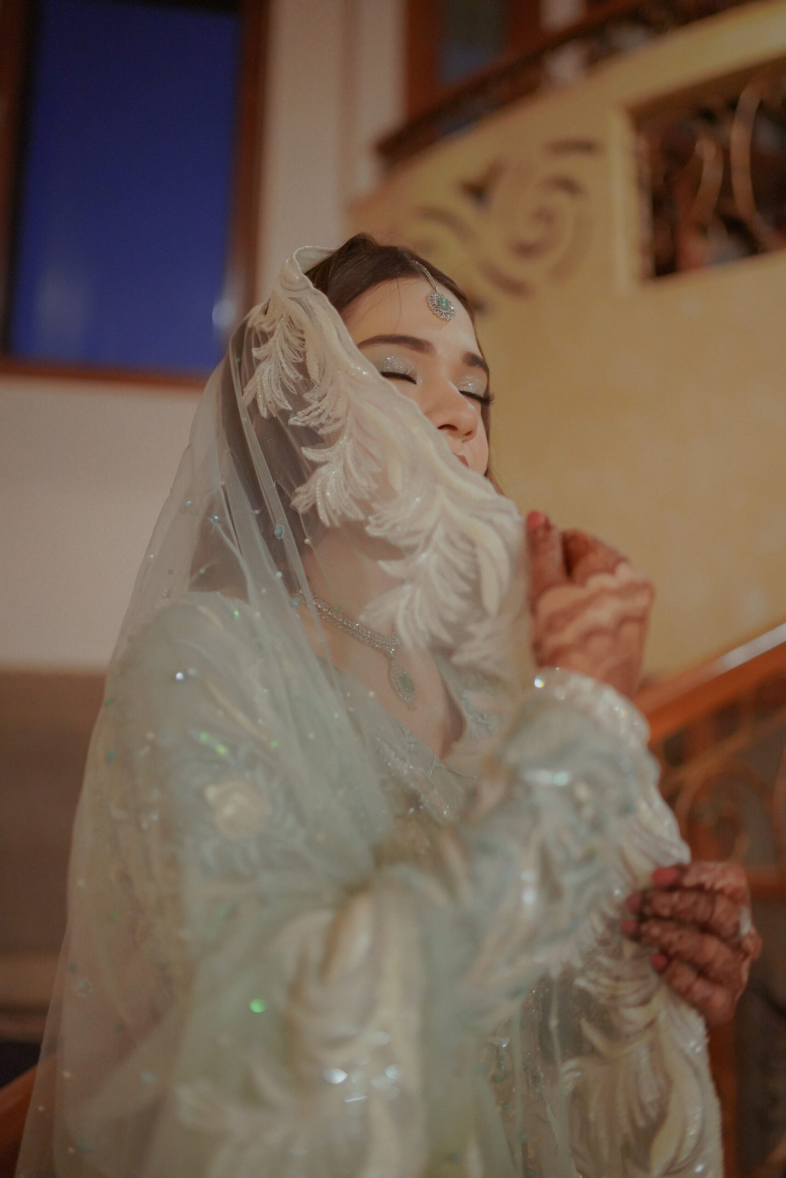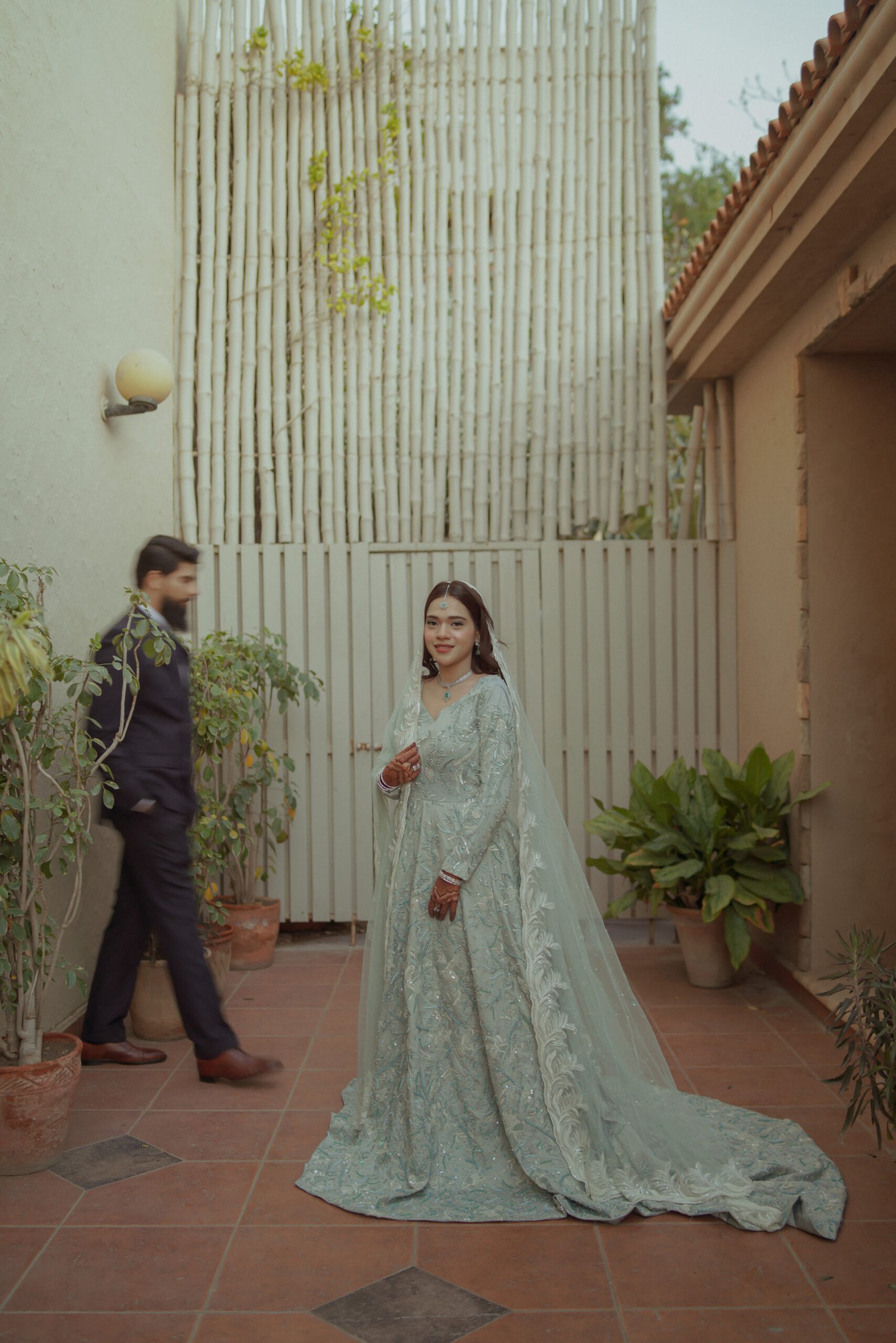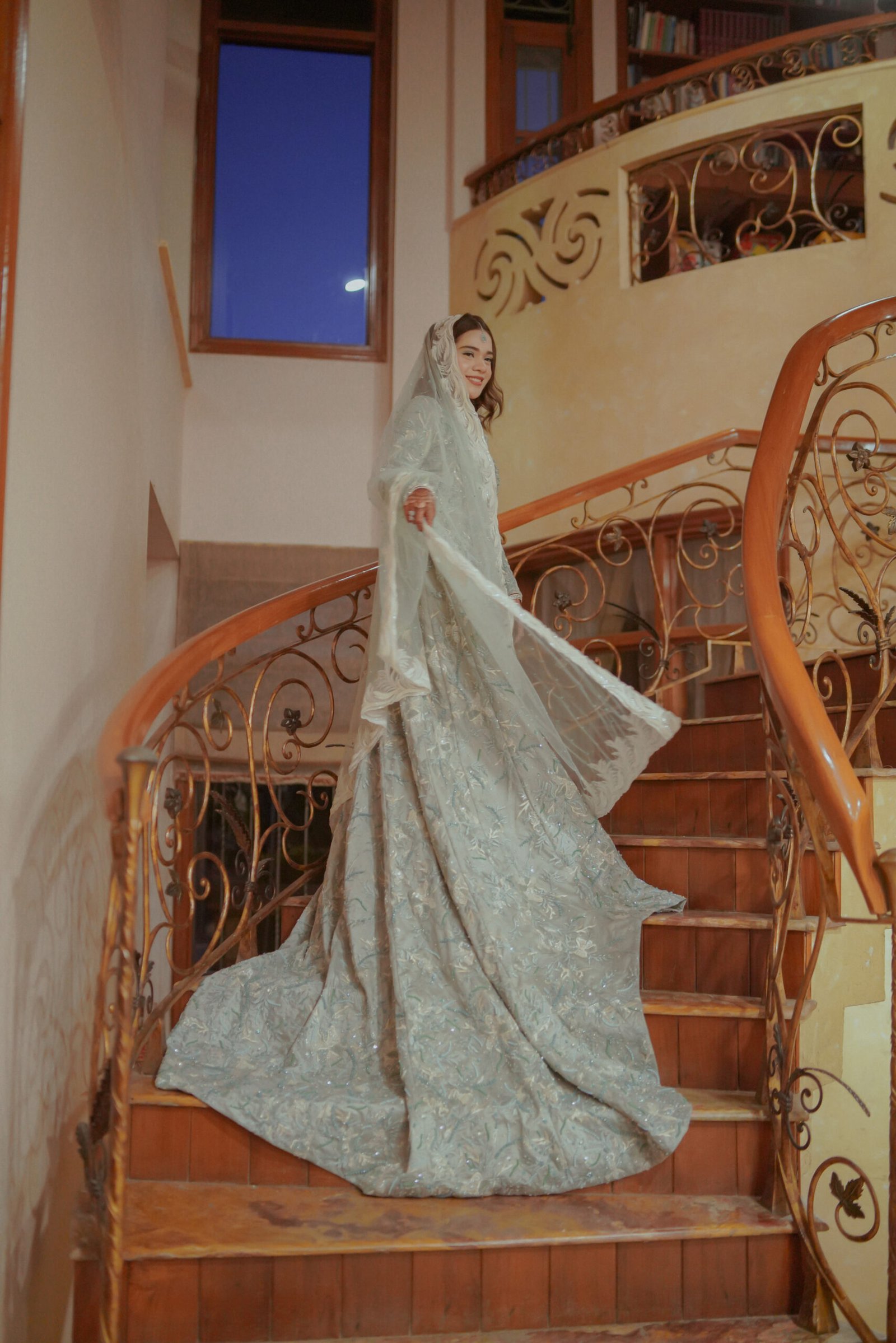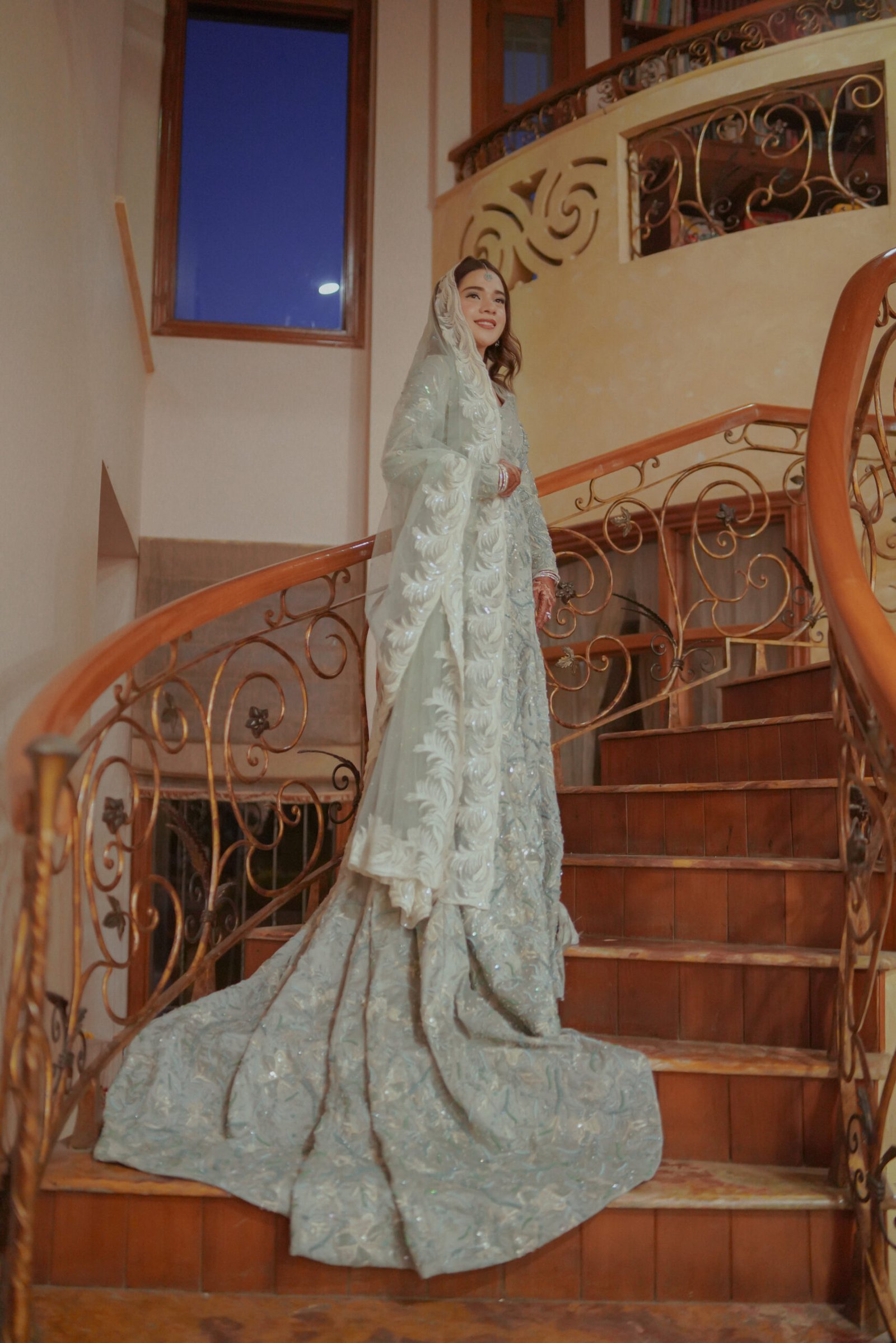 This exquisite outfit features intricate hand embroidery delicately woven with shimmering sequins, pearls, and stone, creating a celestial glow with every movement. The long flowing silhouette, paired with a gracefully trailing hem, exudes regal charm. Complemented by a sheer dupatta adorned with ornate white threadwork, this dress is the epitome of grace and grandeur — perfect for brides seeking an ethereal, fairy-tale look.