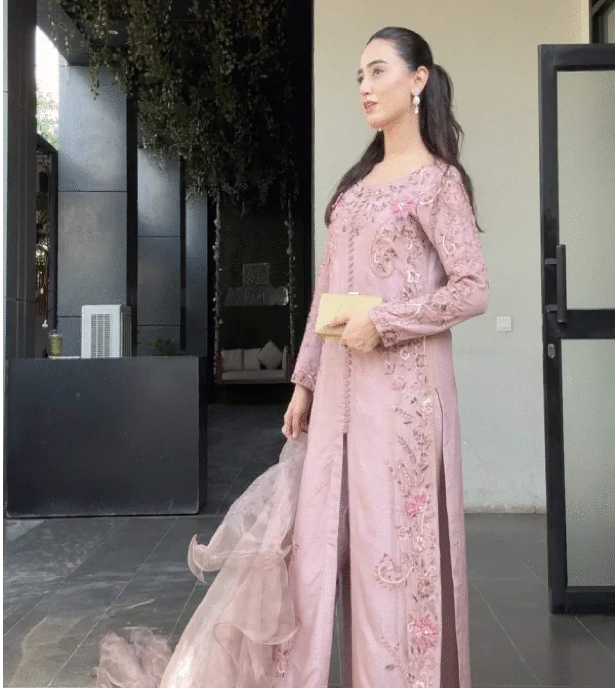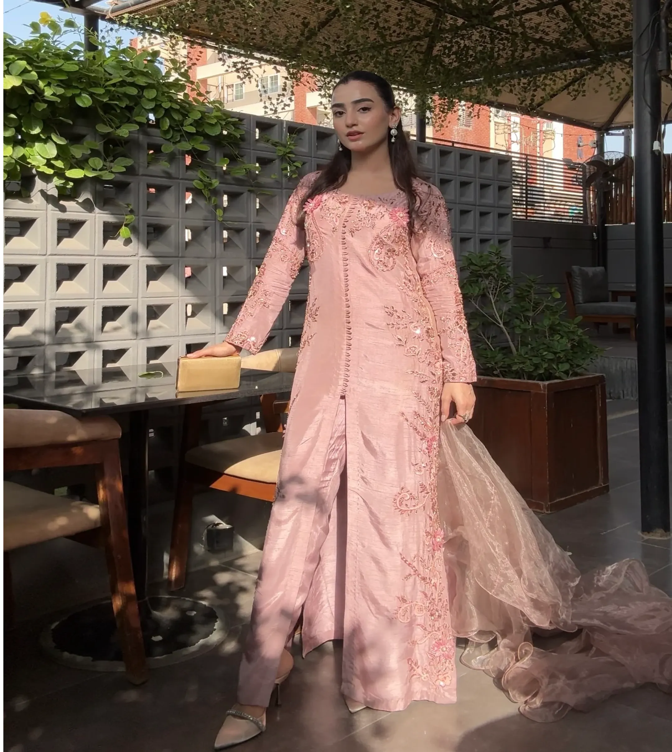 This embellished raw silk suit is a vision of timeless elegance and contemporary charm. Crafted as a long kameez with a chic front slit, it is adorned with delicate 3D flowers, kora dabka, sparkling stones, and pearls, creating a stunning interplay of textures and shine. Each detail reflects exquisite craftsmanship, bringing a touch of luxury to the design while maintaining a graceful, feminine allure.