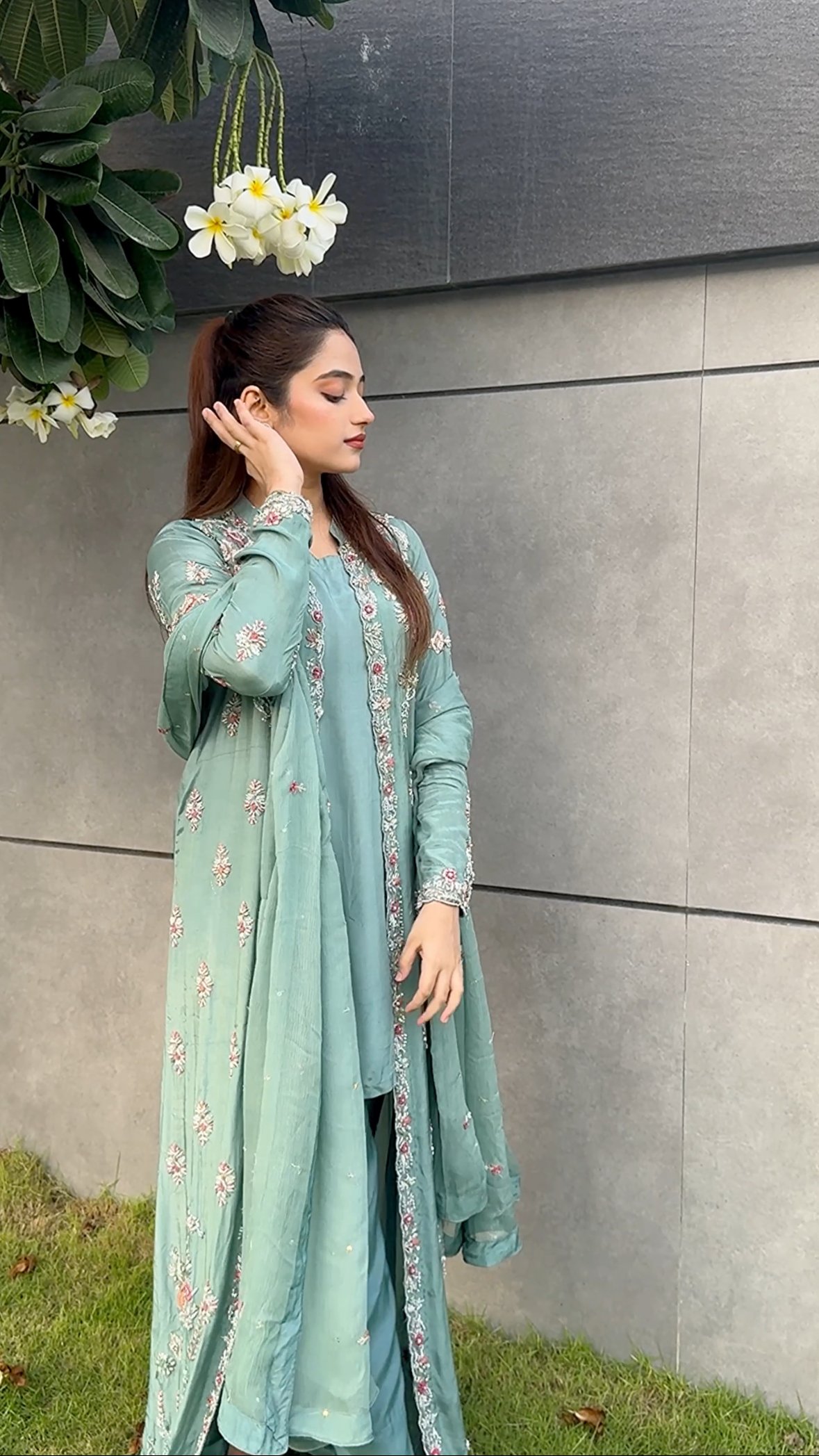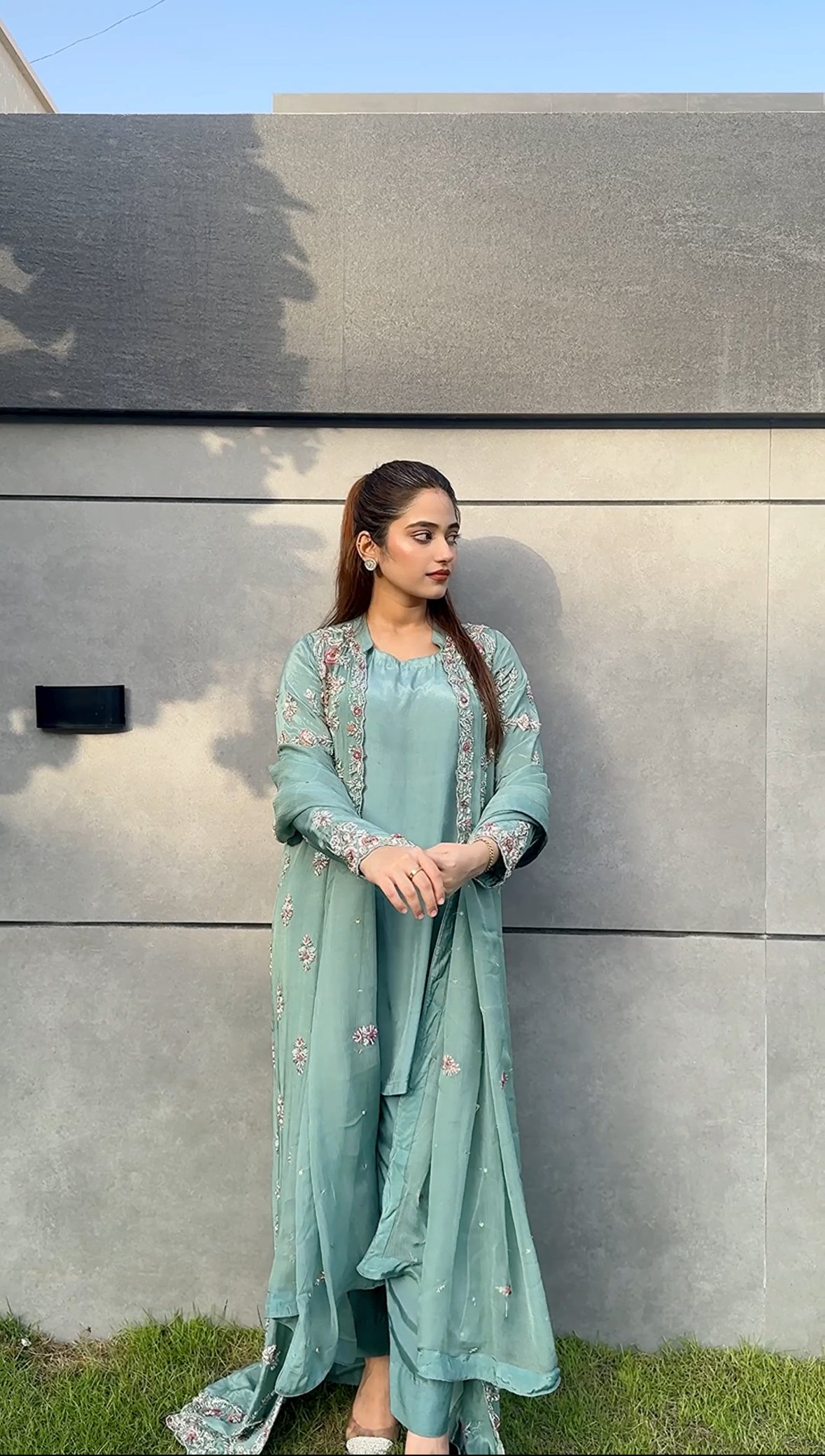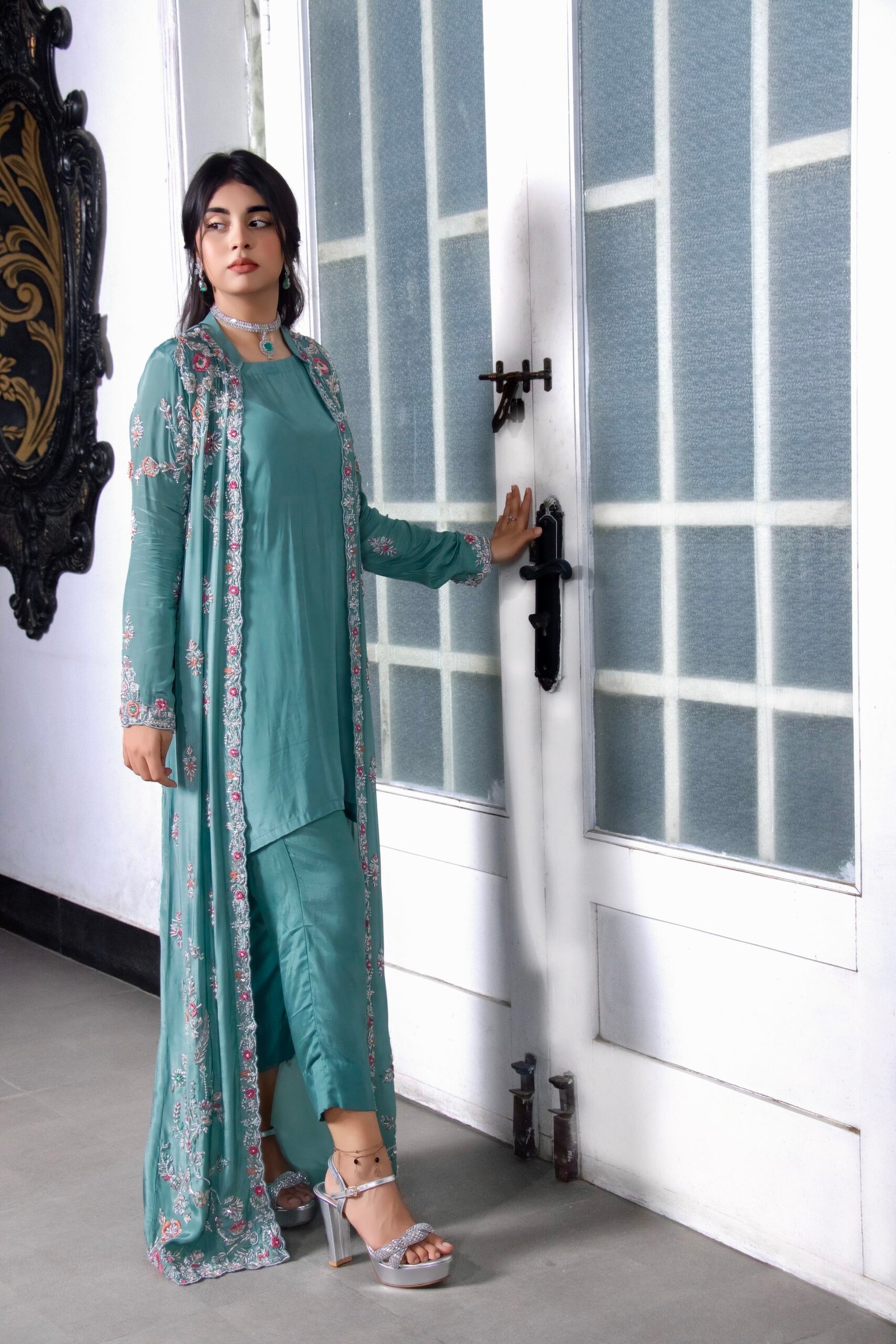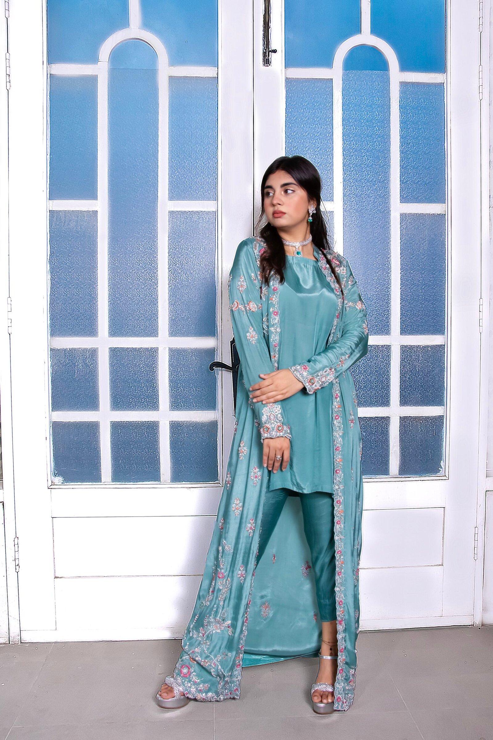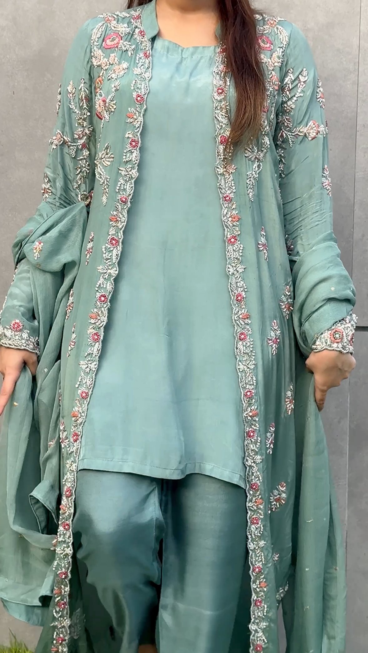 Crafted in an elegant aqua green hue, this jacket style suit exudes timeless grace and sophistication. The coat, adorned with intricate embellishments, is made from luxurious pure silk and features exquisite handwork of kora, dabka, resham, pearls, and stones. Complementing the coat is a chic short shirt and culotte pants, tailored from rich Russian silk, offering a perfect blend of contemporary style and traditional artistry.