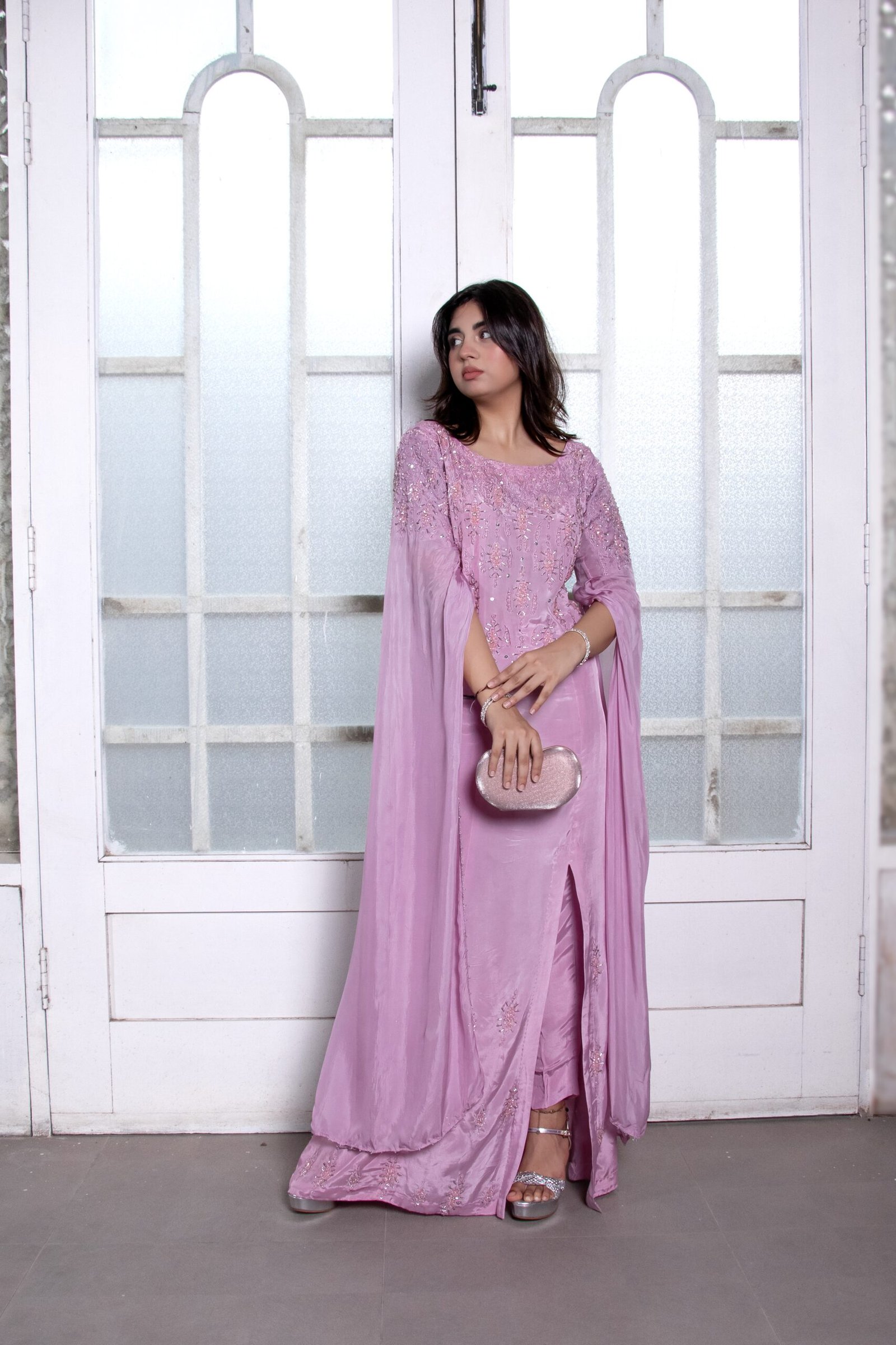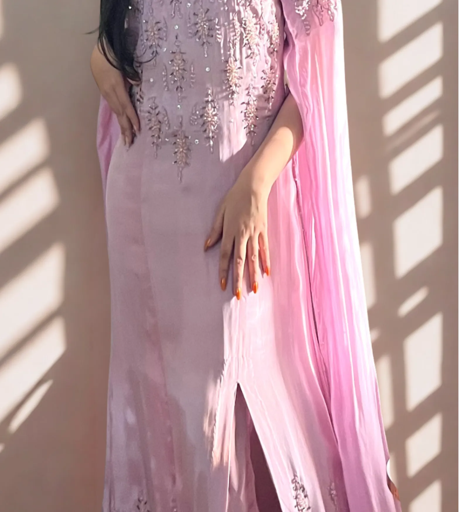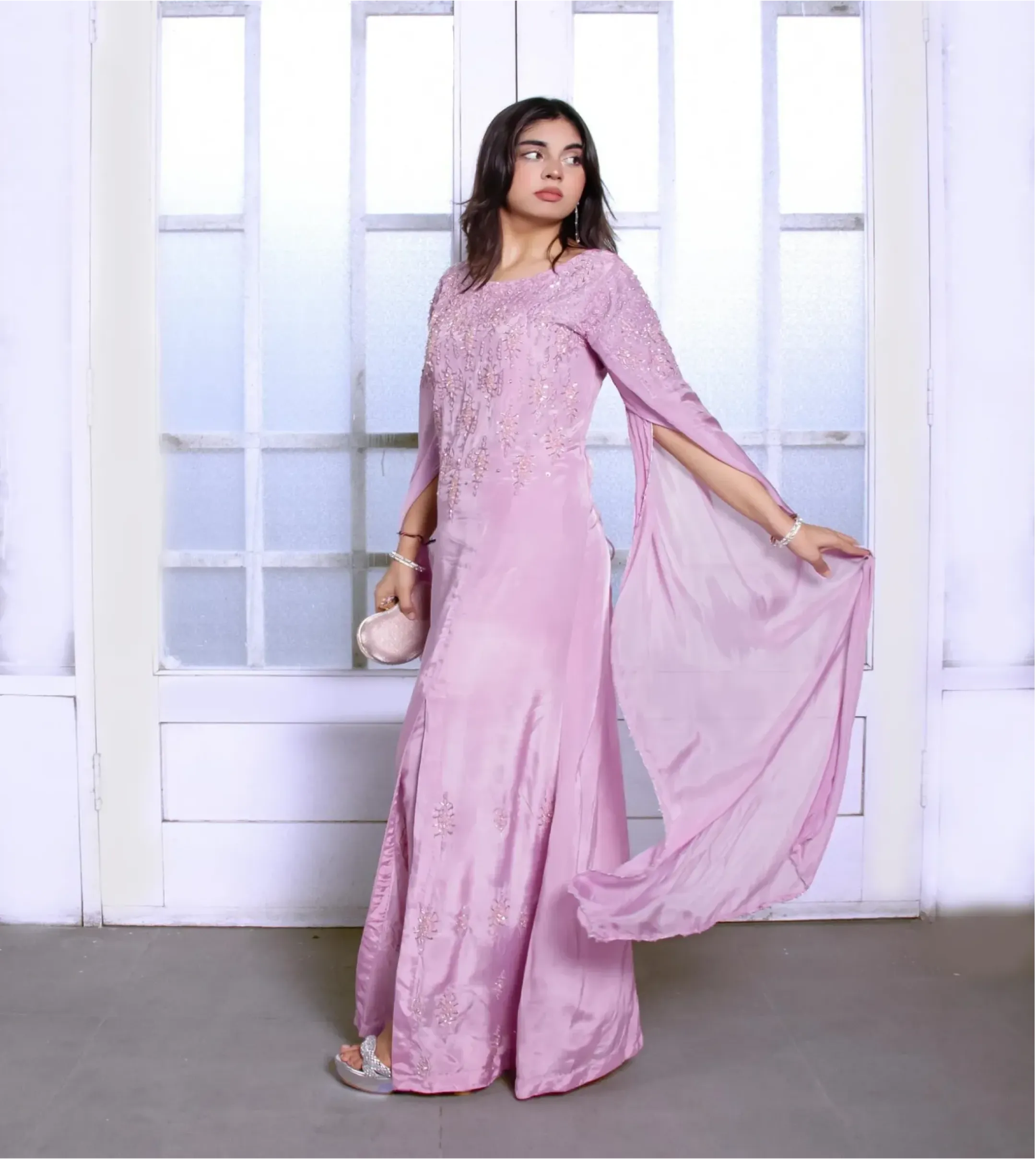 This exquisite long sleeve dress showcases a sleek front slit and sweeping floor-length sleeves, adding a touch of drama to its elegant silhouette. The neckline, sleeves, and hem are adorned with intricate pearl and stone embellishments, creating a harmonious blend of luxury and sophistication. Ideal for making a lasting impression at any formal event, this dress embodies timeless charm with a modern flair.