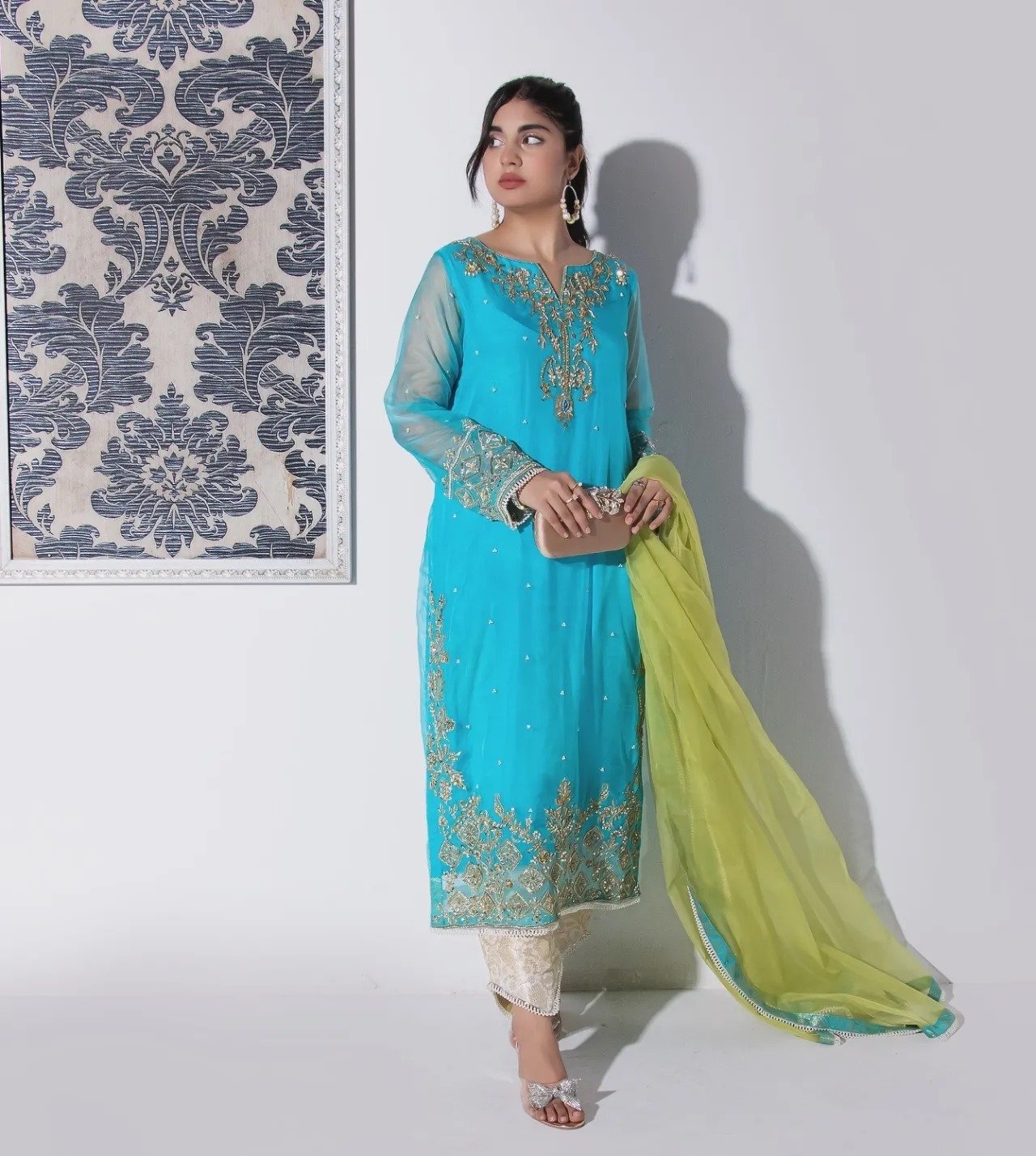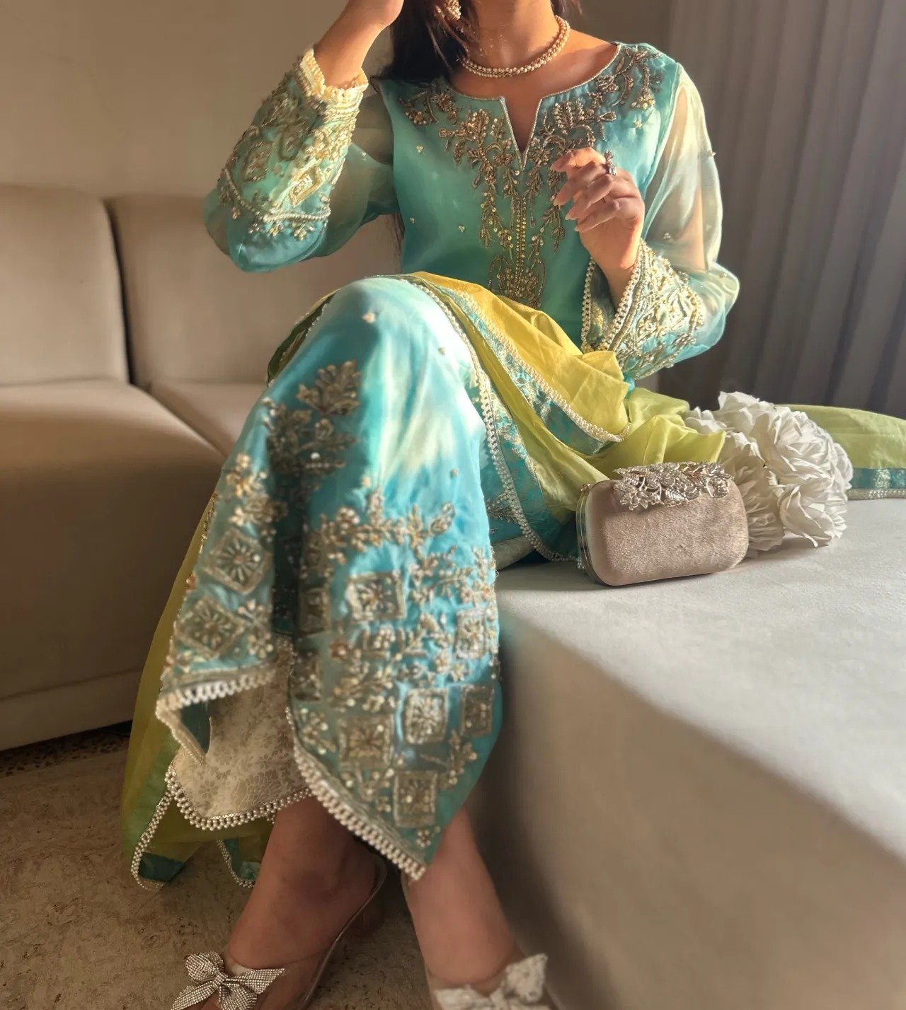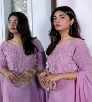 Neelofer is designed to make a statement at any festive event. This exquisite piece showcases intricate hand embellishments in kora, dabka, resham, pearls, and stones, beautifully adorning the neckline, sleeves, and daaman. Paired with a vibrant lime green dupatta and luxurious banarsi shalwar pants, this Pakistani formal wear harmoniously blends rich textures and bold colors, creating a captivating and memorable look. Ideal for weddings, celebrations, or any special occasion, Shehzadi Neelofer ensures that you shine with confidence and style, making it a must-have addition to your festive wardrobe.