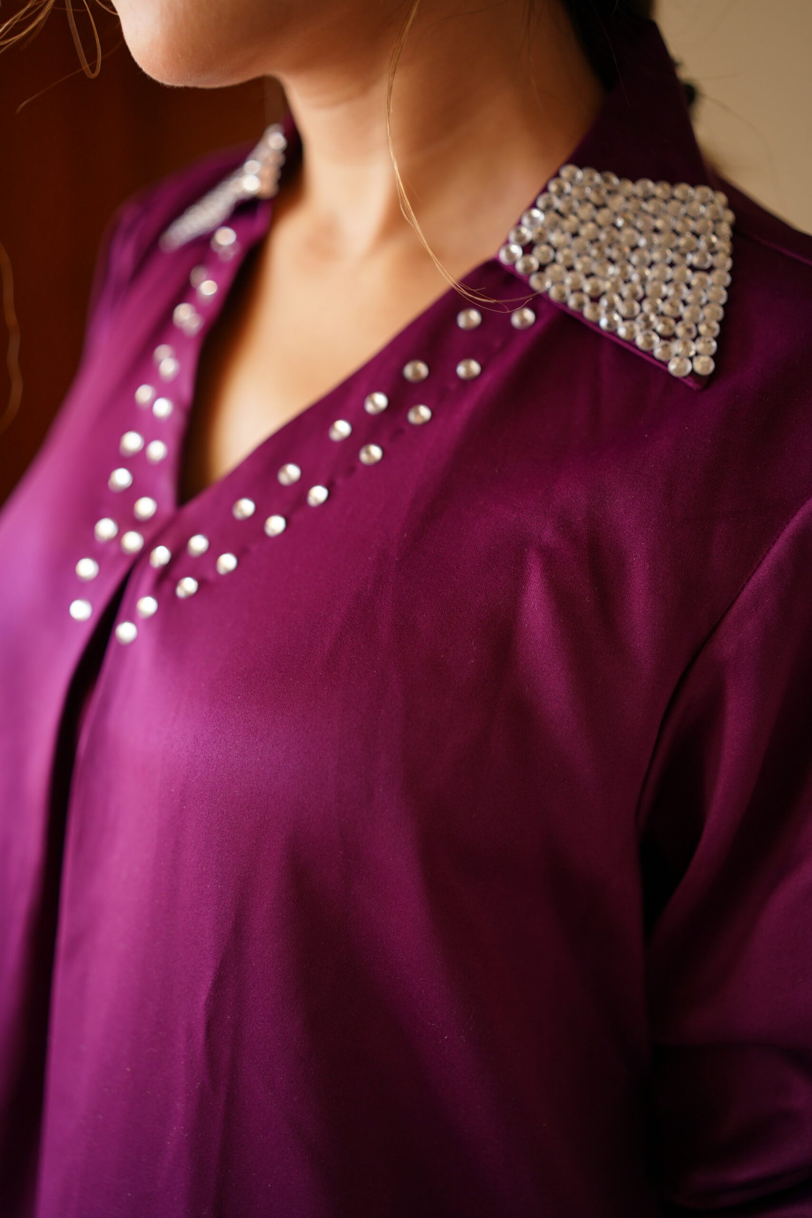 Unveil timeless sophistication with Plum Serenity, a stunning silk 2-piece set designed for the modern woman. Crafted in a rich plum hue, this ensemble features a sleek kameez with a stone-studded collar that adds a subtle sparkle, paired effortlessly with contemporary culotte pants. The luxurious silk fabric drapes beautifully, offering both comfort and sophistication. Ideal for festive occasions, evening events, or refined gatherings, Plum Serenity is the perfect blend of elegance and contemporary style.