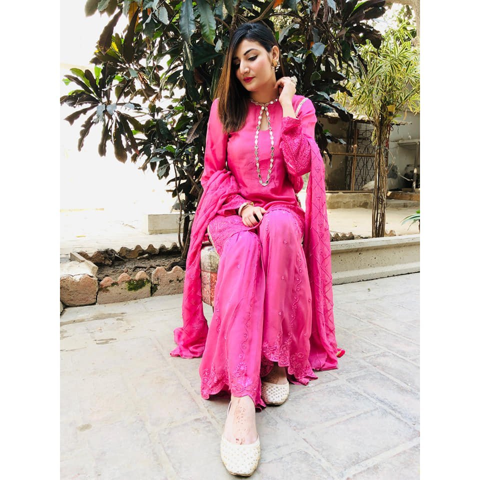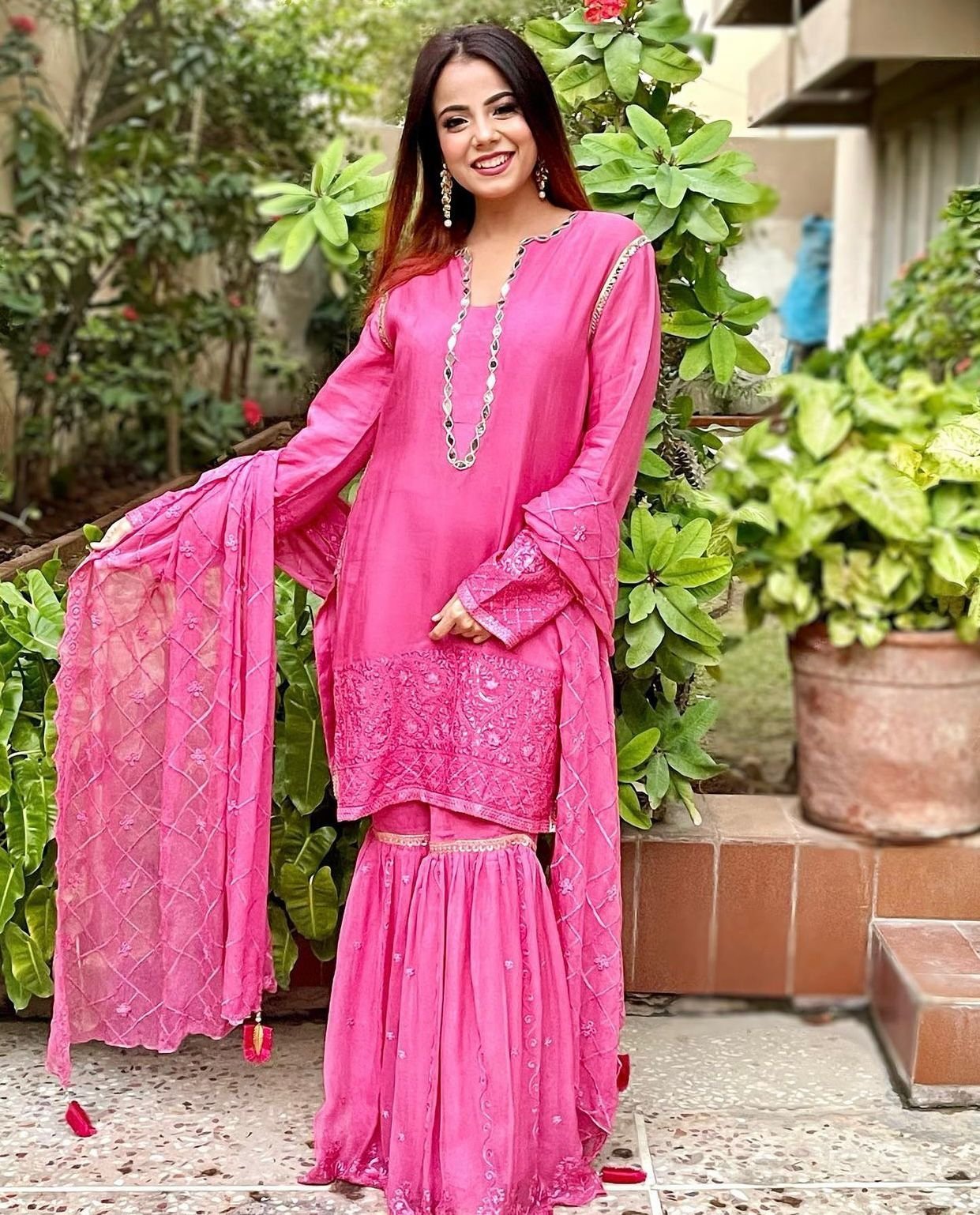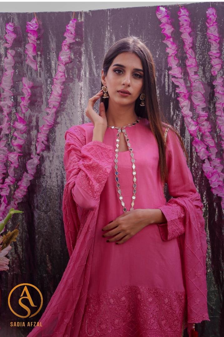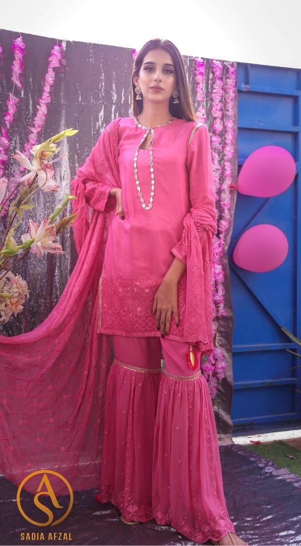The eye-catching shocking pink hue exudes confidence, while the self-embroidery details elevate the outfit, making it perfect for festive occasions or weddings. Radiate elegance and charm in this beautifully crafted gharara set that embodies timeless beauty and contemporary style.